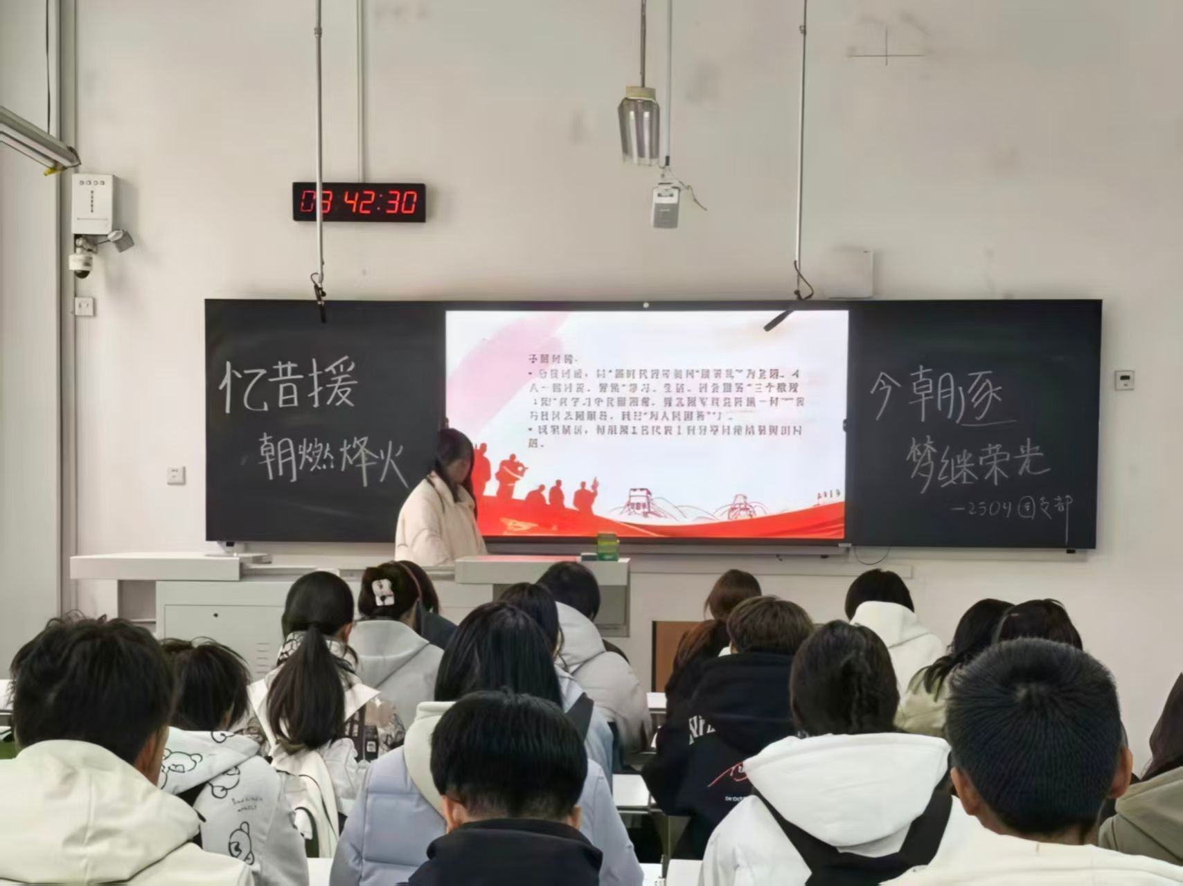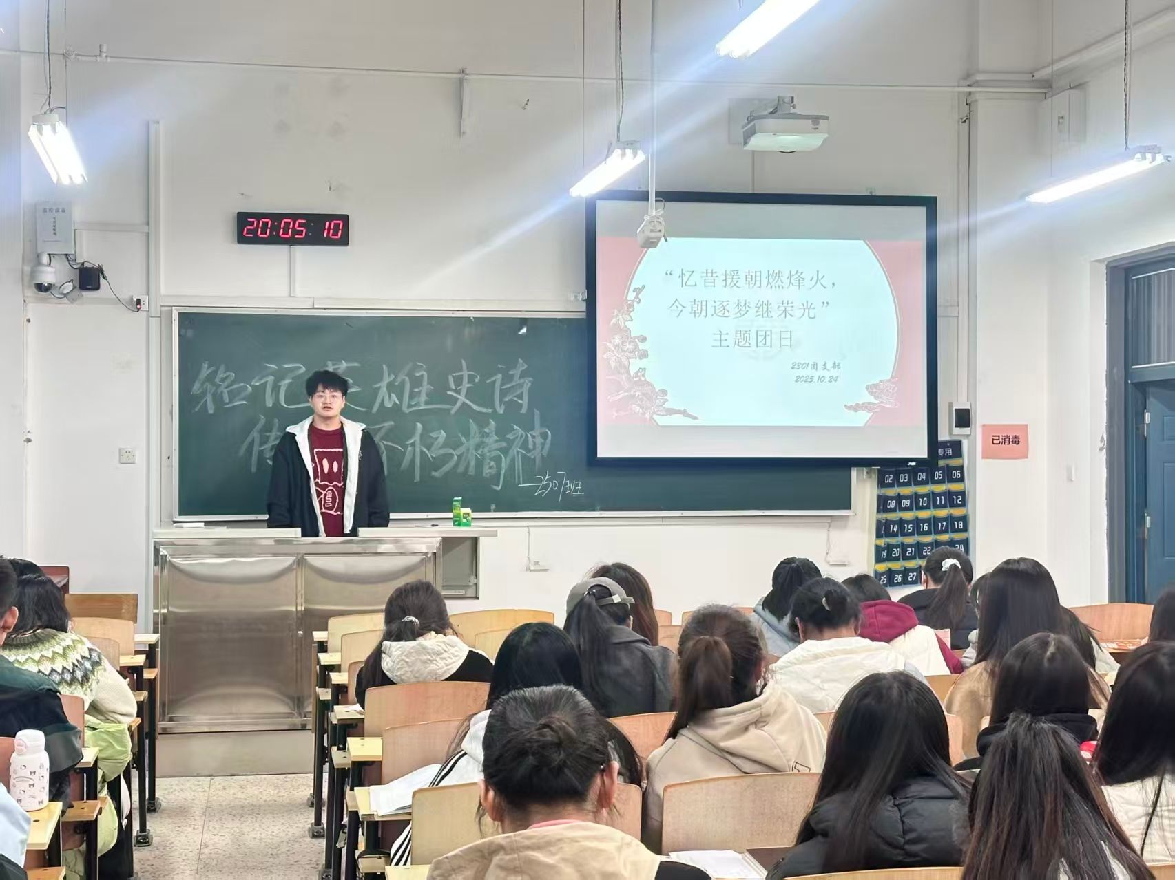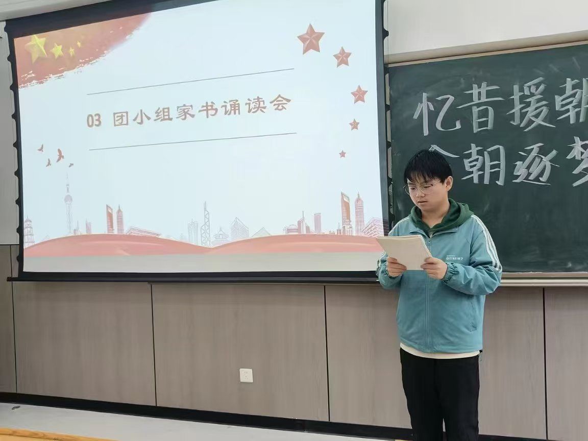 活动伊始,各团支部组织同学们集中观看抗美援朝主题纪录片《冰血长津湖》片段,学习《铭记伟大历史,推进伟大事业》文章,在光影与文字的交织中,大家深刻感受到那段艰苦卓绝的岁月,被志愿军将士不畏牺牲、保家卫国的崇高精神深深震撼。随后,各团支部相继开展战地家书诵读,并围绕“新时代青年如何传承抗美援朝精神”进行主题研讨,引导同学们将历史震撼转化为奋进动力,进一步坚定了传承红色基因、担当复兴使命的理想信念。