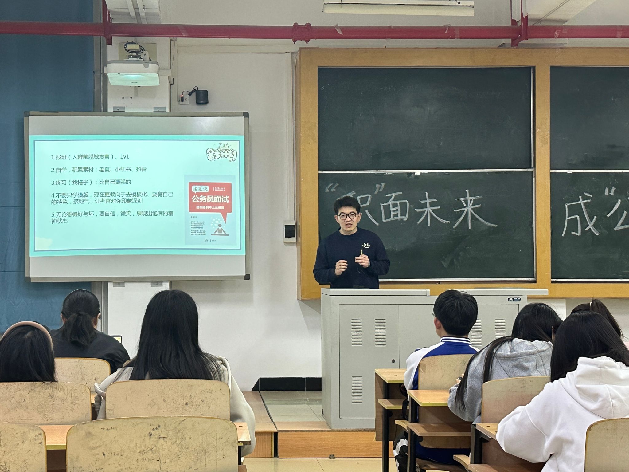 为助力同学们在考公考编之路上精准发力,提高备考效率,公司于4月18日下午18:30在南区5409教室举办了“‘职’面未来,成‘公’上岸”考公考编宣讲会。本次宣讲会邀请了公司成功上岸的优秀毕业生冀定斌和2106班许晴为同学们做经验分享。