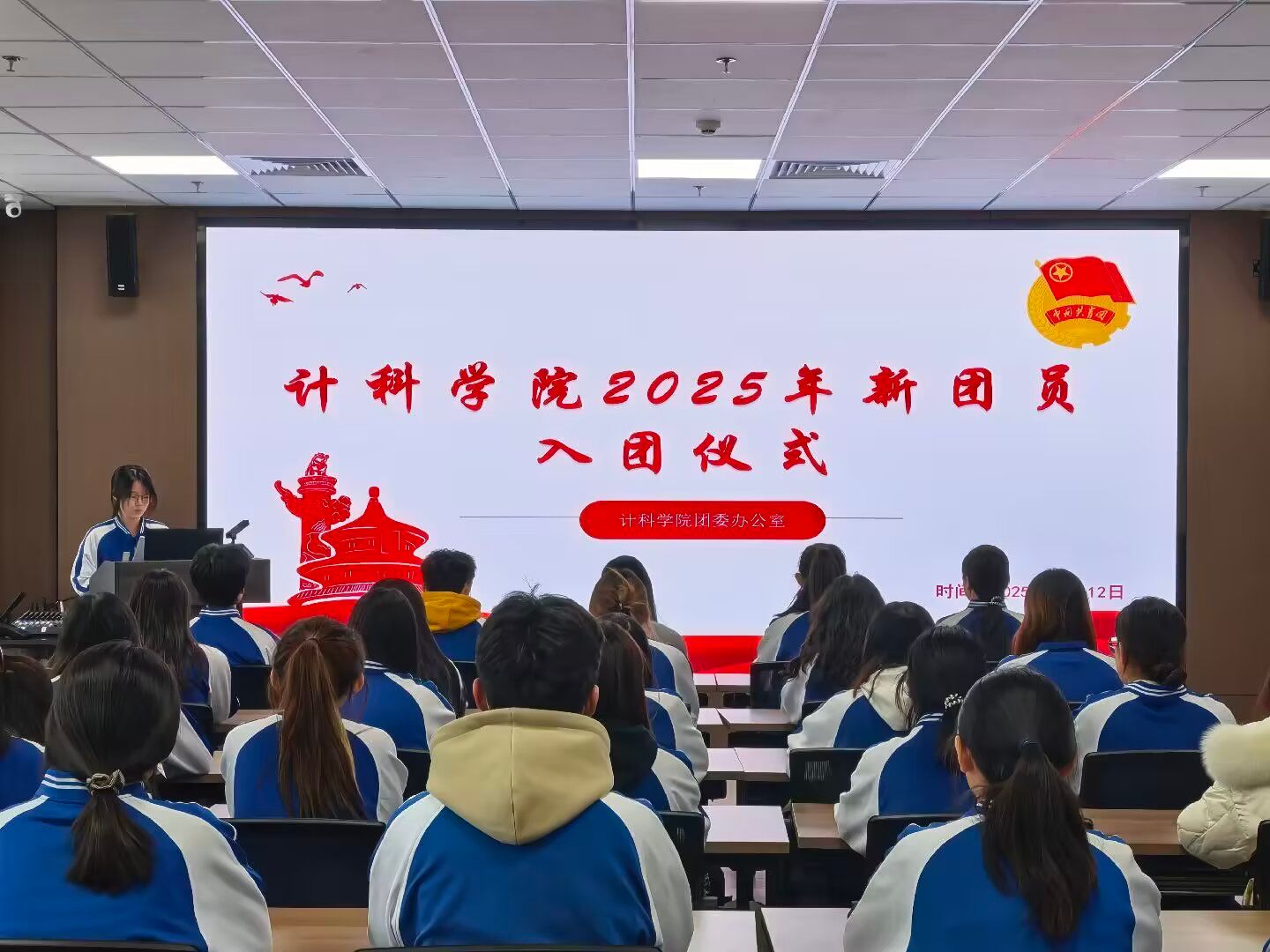 仪式在庄严的国歌声中拉开序幕,全体人员肃立,嘹亮的国歌奏响了青春奋进的序曲。随后,院团办负责人连映慧宣读新发展团员名单,院团委书记赵林涛为新团员代表颁发团徽与团员证,团徽既是共青团员的身份标识,更承载着一份不容懈怠的责任与使命。
