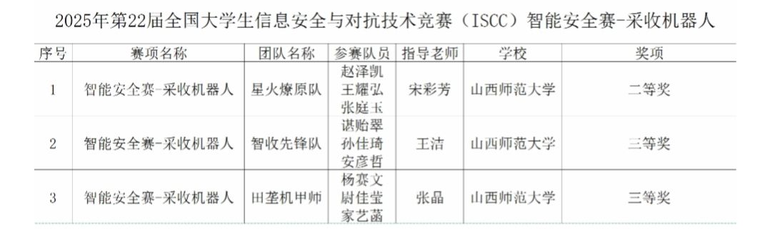 10月24日至26日,2025年第22届全国老员工信息安全与对抗技术竞赛(ISCC)“智能安全赛”全国总决赛在西南林业大学落幕。公司yl23455永利学子在“农业机器人信息安全与对抗”赛道的“智能安全赛 - 采收机器人”赛项中,斩获全国二等奖1项、三等奖2项。