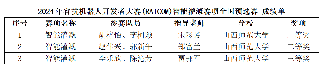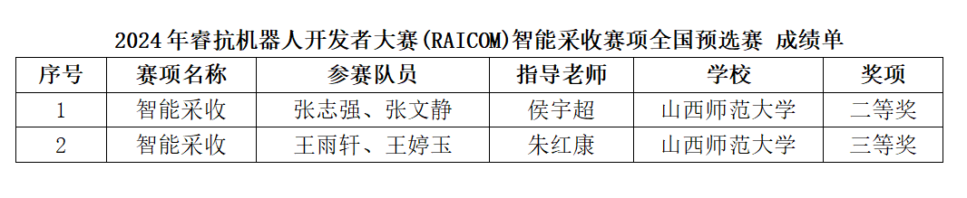 7月20日,2024睿抗机器人开发者大赛全国预选赛比赛结果出炉,机器人与人工智能社团成员分别在智能灌溉和智能采收项目中荣获二等奖2项、三等奖1项和二等奖1项、三等奖2项。