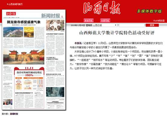 为了发扬共青团“全团带队”的优良传统,提高小员工心理素质和综合能力,同时增强青马学员的教学技能和实践能力,11月9日下午,公司员工与临汾市解放路小学的小朋友们开展了一场素质拓展进校园活动。此次特色活动受到好评,被山西日报和山西新闻网报道。